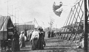 It's the neatest trick you ever see, I'll wager.' 'I'll back the one I'm goin' to show you for twice the money,' said the young barrer-man; and makin' a spring at the chap on a stool, he had him down and with his head in chancery afore you could count six. 'The sitiwation was embarrassin,' as they say in the newspapers; and swearin' that it was all a joke, the purse dodger gave him back the 'arfcrown and sneaked off rapid. I hope his father won't read this, for on condition of young Ned spendin' a shillin' in a couple of pots of beer we promised not to tell him. "Then there's the shows. Barnet Fair sets a example in that line sich as other places of public amoosement might get a wrinkle out of. Women's tastes ain't like men's; their ideas of enjoyment being natarally more delikit. At Barnet they manages to suit all parties, and gives em a opportunity of pairin' off so as to suit their tastes. For instance, while the missus went to the wax work, me and Simmons was in the next tent having a game at skittles; then we took a turn in Sluggers' sparrin'-booth, while the ladies passed a pleasant 'arf-hour in the Star Ghost carawan and got their blood froze for a penny, which, considerin the 'eat of the afternoon, wasn't dear. After that, by way of restorin' their sperits, they went to see the four-legged duck and the big-headed child and the livin' skellington; Bill and me meanwhile enjoyin' ourselves in a wan where there was a Kaffir eating live rats; by which time we was ready for tea and a relish with it. "After that, findin' ourselves in cheerful company, and a fiddle comin' in, we had a song and then a dance. Lots of dancers, and werry glad we were that beer was sold on the premises, and I believe we should have kep' it up later than we did, had not that confounded cat's-meat man that Simmons fell foul of in the morning poked his ugly 'ead in, on which Simmons, who had got the liquor aboard, wanted satisfackshun for his black eye. That was only fair; so while the women found their shawls they settled their little difference outside, after which we ordered the barrer, and by means of steddy drivin' and stoppin' to breathe the pony at every place that had a sign-board hanging out, we managed to get back to Mile-end just in time to get a partin' drain before the houses closed."